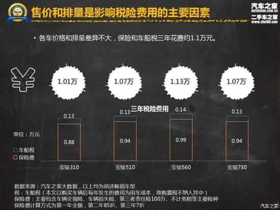 众所周知,车辆的售价和排量是影响税险费用的主要因素,但宝骏这四款车型均在1.8L排量及以下,价格也都相差不多,因此在保费方面,四款车型车距非常小,三年总花费基本位置在1万元以内。;在车船税方面,除了1.8L排量的宝骏560车型为0.14万元之外,另外三款车型都为0.13万元。此外,购车装饰费、年检费、维修费等不确定性的收费项目,不在本报告讨论范围内。