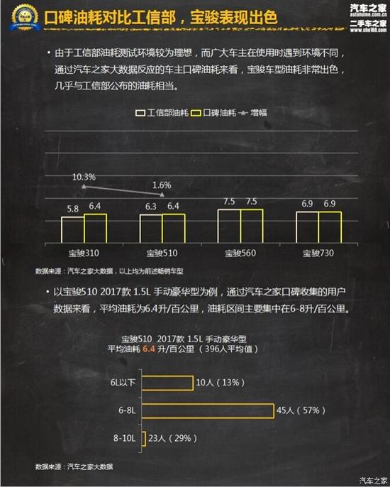 大家都知道,一般情况下工信部的油耗测试由于环境较为理想,因此在车主在实际使用中的真实油耗要比工信部数值高一些。但通过汽车之家大数据反应的车主口碑油耗来看,宝骏车型的油耗表现几乎与工信部公布的油耗持平。以宝骏510 2017款1.5L手动豪华型为例,在样本量为396人的情况下,平均油耗为6.4L/100km,仅比工信部油耗高出0.1L/100km,因此宝骏系列车型的油耗表现,确实是非常突出的。