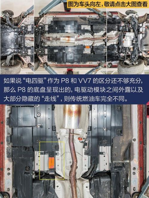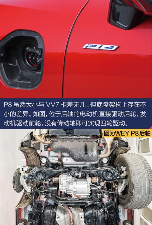 一方面,P8出自全新的Pi4平台,P即PLUG-IN(表示插电混动),i代表智能,4则是四驱的意思,这是一台由发动机输出前轮、电动机驱动后轮,没有传动轴的电四驱车型。另一方面,在加入电池、电动机以及电驱动模块之后,各个核心部件的位置,乃至各用电元件的“走线”都跟传统燃油车不同。