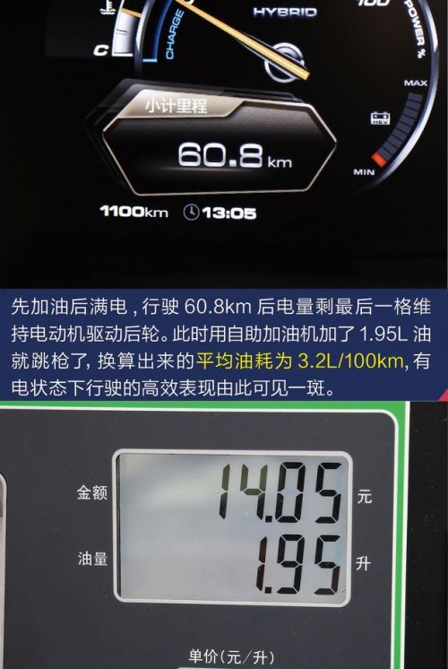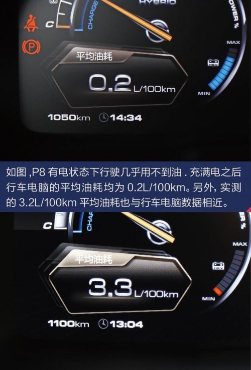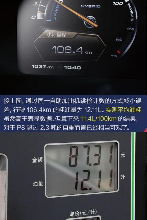 如我们此前测试的插电混动车型,有电状态下的性能和油耗是强项,而没电之后的行驶效率则会大打折扣,当我看到自重数据的时候,对P8的实际行驶表现并不看好,而从实际测试结果来看,P8的油耗打消了我的顾虑。没电状态下先在自助加油机加到跳枪,之后行驶106.4km再回到同一个自助加油机,到跳枪的加油量为12.11L,平均油耗换算下来大约是11.4L/100km。