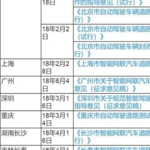 2018年中国自动驾驶发展加速。自2017年末,北京率先推出中国首个自动驾驶汽车路测法规后,保定、上海、重庆、深圳、长沙、长春、平潭、广州先后出台自动驾驶路测法规,同时这些城市还为车企发放了路测牌照。目前,百度、腾讯、一汽、蔚来汽车、吉利、东风等车企正在有条不紊地开展路测。