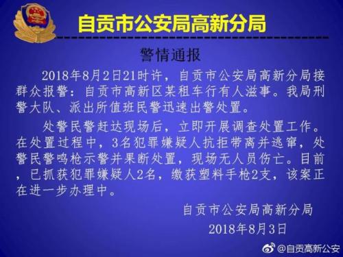针对“四川自贡租车行发生枪击案”的网络传闻,8月3日,自贡市公安局高新分局在官方微博发布警情通报:2018年8月2日21时许,自贡市公安局高新分局接群众报警:自贡市高新区某租车行有人滋事。分局刑警大队、派出所值班民警迅速出警处置。