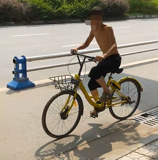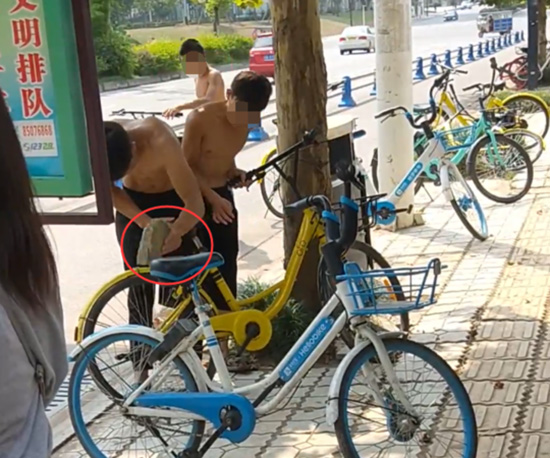 8月14日下午,市民杨青正在龙泉大面街道等公交车,车站旁停着一些共享单车,三个赤裸上身的男子围着车不停地转悠。这样的行为引起了杨青的注意,他随即拿出手机偷偷拍摄。没料到,三个男子找来了石头,开始对着车锁一顿猛砸。