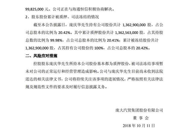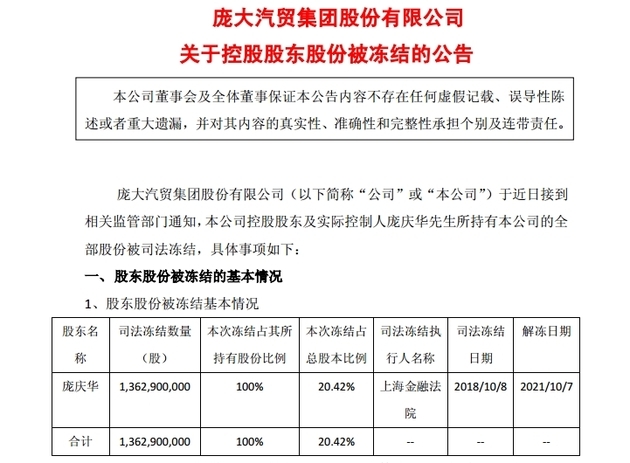 截至今年7月,庞庆华持有庞大集团股份共计13.629亿股,占公司总股本的比例为20.42%。其中累计质押股份共计13.62563亿股,占其持股总数的比例为99.98%,占公司总股本的比例为20.41%;累计被冻结股份共计13.629亿股,占其持有公司股份的100%,占公司总股本的20.42%。