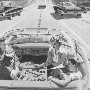 当时的一幅草图展示了乘客将如何度过他们的时间:一家人围坐在小桌子旁,玩着多米诺骨牌游戏。如果不是看到父亲角色后面的方向盘,把这种家庭活动的地点误认为是在客厅而不是高速公路上飞驰的汽车里也不足为奇。