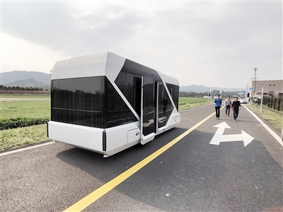 在现场,一辆昵称“二白”的自动驾驶汽车正在进行测试。这辆汽车的外形像一辆迷你型的公交车,黑白相间的外形相当炫酷。