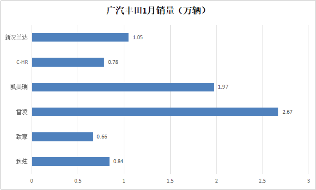 广汽丰田在1月也迎来“开门红”。数据显示,1月,广汽丰田累计销量约为8万辆,同比增长75%,第八代凯美瑞、雷凌家族、C-HR、YARiS L家族均刷新单月销量纪录。