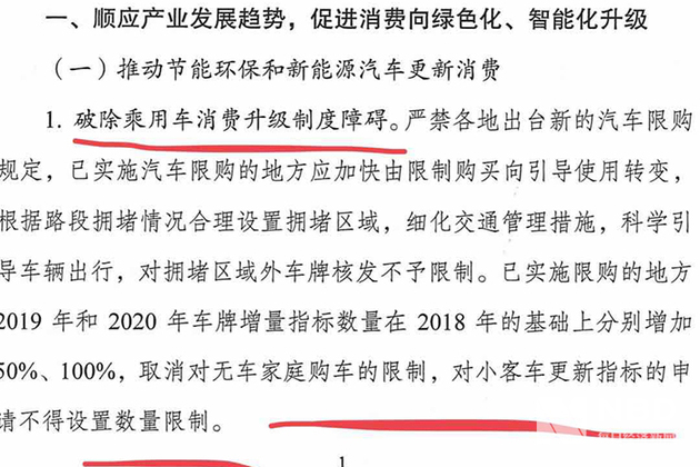 该征求意见稿显示,“推动节能环保和新能源汽车更新消费的实施方案之一是,破除乘用车消费升级制度障碍,严禁各地出台新的汽车限购规定,已实施汽车限购的地方应加快由限制购买向引导使用转变,根据路段拥堵情况合理设置拥堵区域,细化交通管理措施,科学引导车辆出行,对拥堵区域外车牌核发不予限制。已实施限购的地方2019年和2020年车牌增量指标数量在2018年的基础上分别增加50%、100%,取消对无车家庭购车的限制,对小客车更新指标的申请不得设置数量限制。”