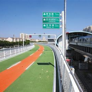 昨天,紧邻地铁13号线的北京首条自行车专用路已经建成,高出地面五六米。自行车专用路将于5月31日上午7时开通,限速15公里/小时,行人、电动自行车禁入。其中红色的是潮汐车道,绿色的是正常行驶车道。开通后26分钟可从昌平回龙观骑行到海淀上地软件园,有望缓解两地间的交通拥堵状况,惠及约1.16万“通勤族”。新京报记者 王贵彬 裴剑飞 摄影报道