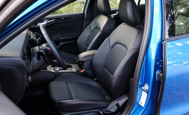 内饰整体的设计与上一代车型相比更具层次感,整个内饰的用料在同级别车型中处于中上等水平,中控台和门板上都有大面积的软质材料,ST Line车型还有红色缝线以及类似碳纤维纹路的内饰板来烘托运动氛围。上一代车型上的嵌入式中控屏改为了悬浮式,8英寸的屏幕尺寸放到现在来看并不算突出,不过这套SYNC 3车机系统还是非常好用的,逻辑清晰并且触屏操作反应灵敏。日常高频率使用的音量调节、歌曲切换、空调温度以及风量调节等保留了实体按键。