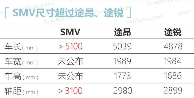 基于MQB B平台打造的一汽-大众SMV,车长超过5.1米,轴距也将达到3.1米左右。参考同平台途昂的动力,SMV将搭载2.0T(高/低功率)发动机、2.5T V6发动机,最大功率分别为162kW、137kW、220kW,峰值扭矩分别为350N.m、320N.m、500N.m,传动系统匹配7速双离合变速箱,2.0T高功率以上车型配备四驱系统。