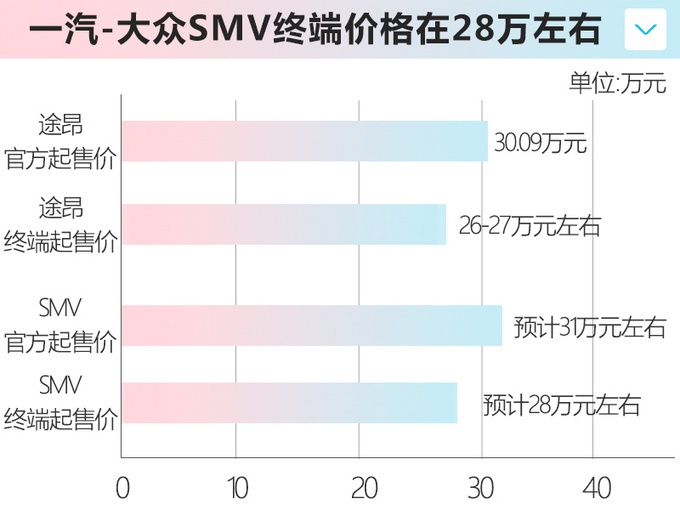 售价方面,综合SMV的尺寸以及途昂(30.09-50.59万元)的定价,预计新车起售价在31万元左右。不过参考途昂目前的终端优惠情况(入门版车型优惠在3-4万元左右,优惠后在26-27万元左右),未来新车的终端价格也将跌破30万元大关,大概在28万元左右。