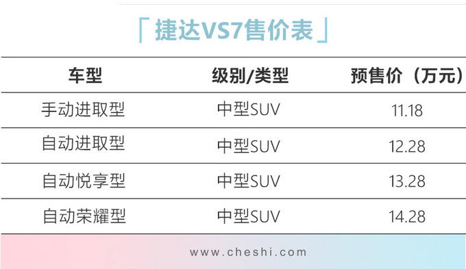 1月11日,捷达品牌第三款车型VS7开启预售,共推出4款配置车型,预售价区间为11.18万- 14.28万,将于下月正式上市。近日网上车市通过走访一汽-大众捷达经销商了解到,捷达VS7 (配置|询价)的最终上市价格可能会低于现阶段的预售价格。