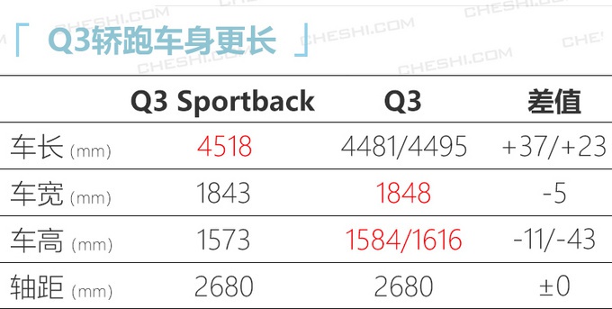 和奔驰、宝马旗下紧凑型轿跑SUV产品策略不同(GLA尺寸小于GLB,X2尺寸小于X1),奥迪Q3 Sportback的车身尺寸比普通版Q3稍大一些。与GLA、X2两个主要竞品相比,新车在尺寸上明显占优。动力方面,Q3 Sportback沿用了Q3的1.4T、2.0T(高/低功率)发动机,传动系统匹配7速双离合变速箱,2.0T高配车型将提供四驱系统。