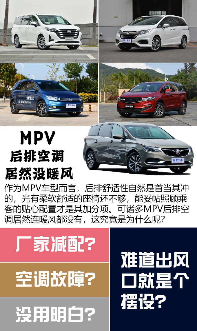 经过一番了解过后,后排出风口无法吹暖风并不是单一现象,自主品牌MPV居多,而合资品牌热销车型也存在这个问题(本田奥德赛 (配置|询价)、大众途安 (配置|询价)L、别克GL6等),那些希望通过“后排出风口”来提升乘坐舒适性的用户,是不是和我一样有上一当的感觉?