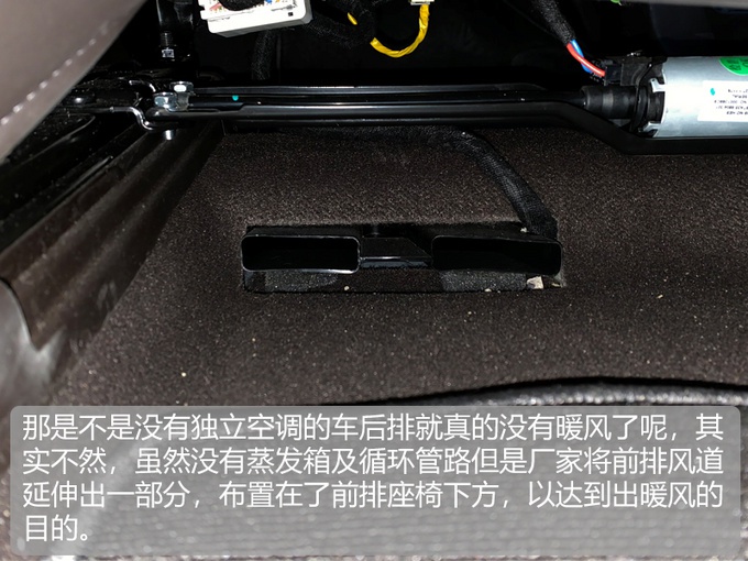 可能看到这就会有人产生疑问:“如果我的车没有独立空调只有出风口,后排座椅是不是就真的没有暖风了呢?”,其实并不是完全没有暖风,厂家虽然控制了成本但还是会考虑后排乘坐体验的,位于前排座椅下方的预留风道会和前排空调一同为车内提供暖风,以保证车内舒适性,根据热空气向上升腾的物理学原理,如果风量达到一定级别,第二排和第三排乘客还是能够逐渐感受到暖意的。
