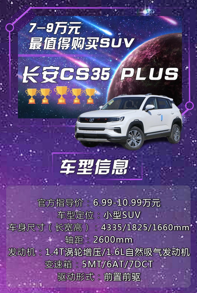 长安CS35 PLUS一直是7万级SUV车型中的黑马,大气耐看的外观、充裕的乘坐空间以及丰富的配置,都是长安CS35 PLUS几大亮点,同时全新1.4T发动机所带来的澎湃动力,也可谓是同级之最,再结合目前几千元的优惠幅度(北京地区),性价比优势明显。