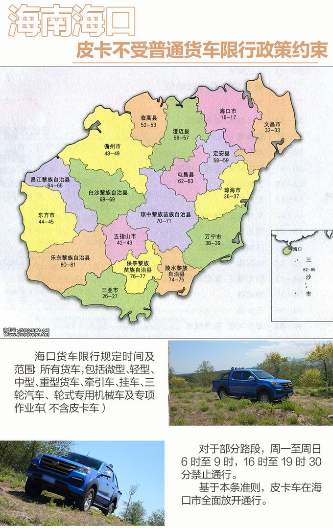 据我们向有关部门核实,海口市的以上政策对于皮卡车型不奏效。也就是说,在海口皮卡车型确实已被划分为货车以外的车型进行管理,海口市皮卡已经完全不受限制。