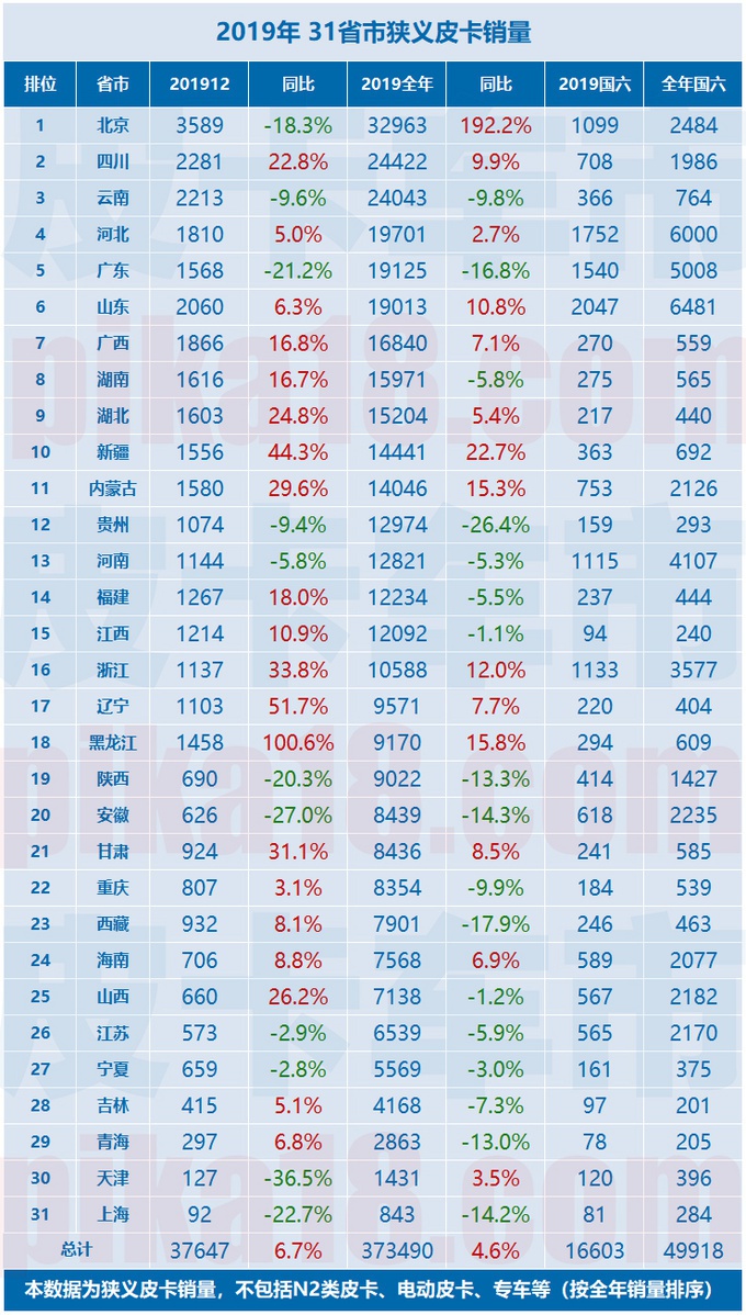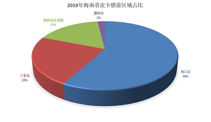 而再加上儋州市和省直辖县级行政单位,海南省全境其实已对皮卡无限制。从2019年销量我们也能看到,海南虽然不是皮卡大省,但是其皮卡市场活力是显而易见的,2019年全年售出皮卡7568辆,同比增长6.9%。在笔者看来,海南由于地处海岛,渔业农业等发达,渔民对于皮卡这类生产资料的需求量大。而且在区域占比上,海口市和三亚市占据了全省销量的80%。