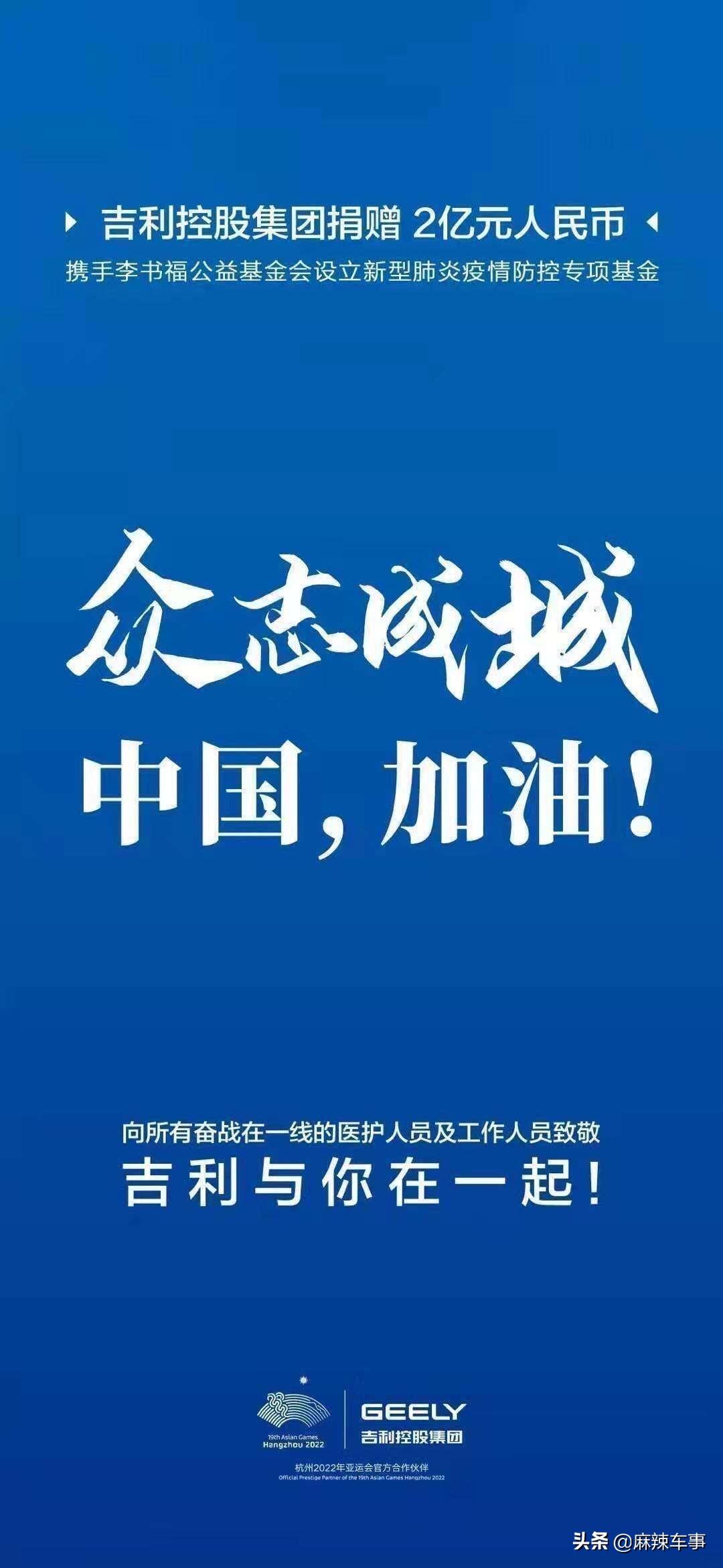 此前,吉利控股集团作为中国汽车品牌的头部企业之一,已于1月28日携手李书福公益基金会,设立2亿元人民币新型肺炎疫情防控专项基金。