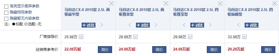 配置方面,CX-8有盲点监测、车道偏离预警系统、车机互联等。不足之处的就是CX-8低配售价已经达到25.88万却没有配备天窗,而且其余三款也是普通小天窗,在很多竞品都配全景天窗后,它是没有竞争力的。