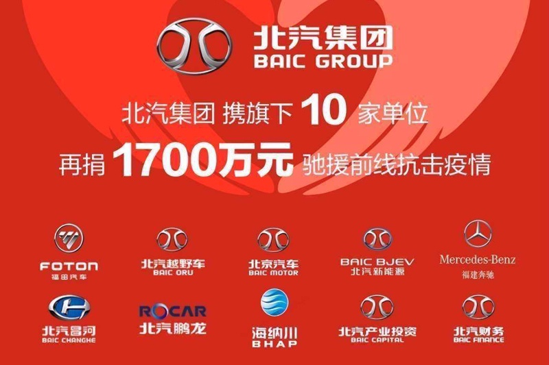 继北汽集团旗下北京奔驰和奔驰销售公司捐赠1000万元、北京现代携手现代汽车捐赠1500万元、北现金融捐赠100万元之后。北汽集团再次联合旗下北京汽车、北京越野、北汽新能源等10家单位,共同捐款1700万元。