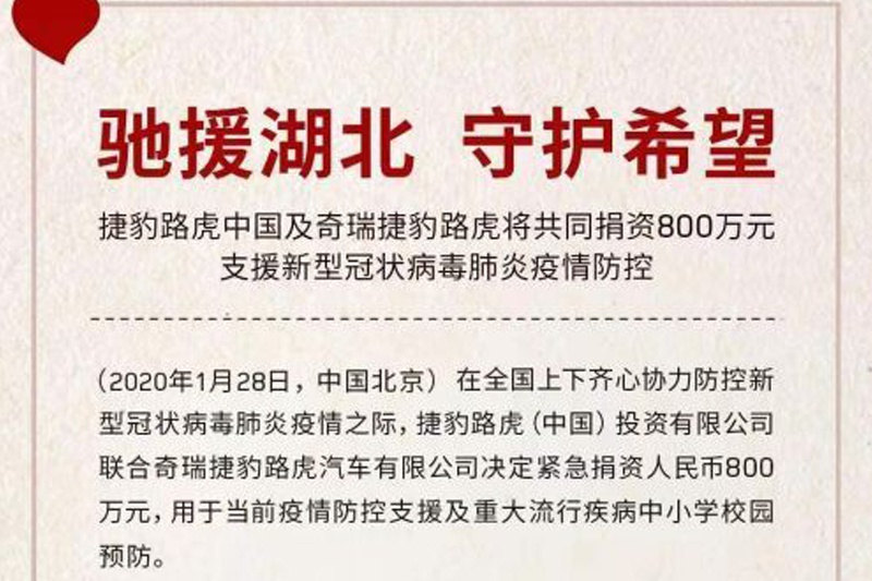 捷豹路虎(中国)投资有限公司联合奇瑞捷豹路虎汽车有限公司决定紧急捐资人民币800万元,这次的捐款内容呢主要是防疫物资和青少年校园防疫两大块。