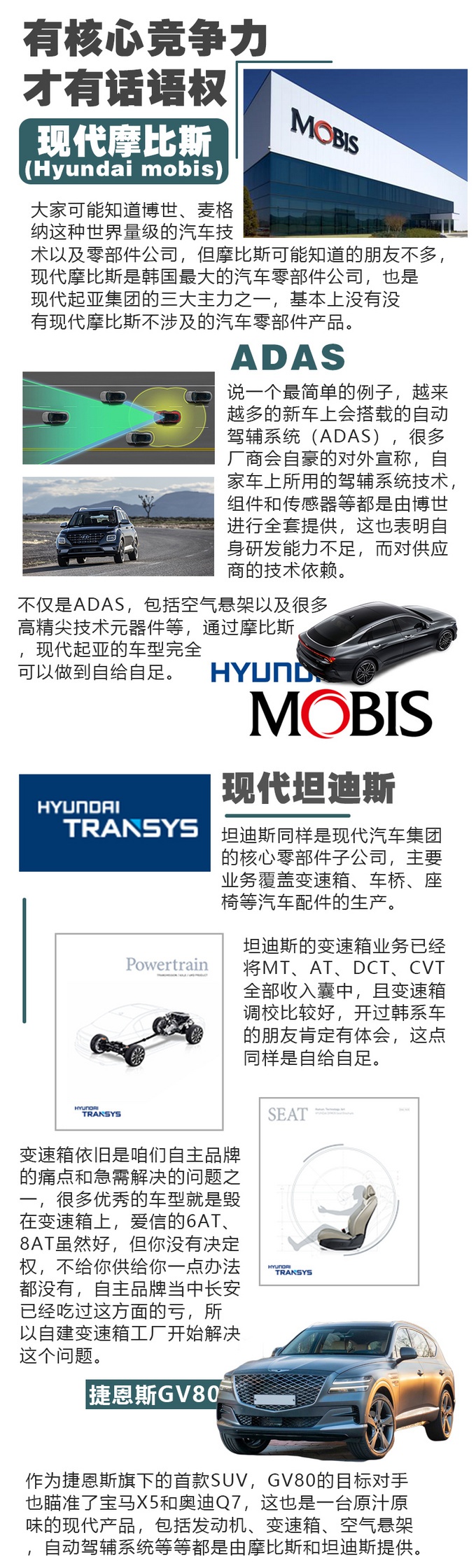 掌握核心技术才有话语权,举个例子,韩国的另一家巨头企业三星(全球最顶级的手机供应链厂商),因为它的顶级OLED屏幕和闪存,苹果也不得向它抛出橄榄枝,最新的iphone11 pro和pro MAX也是三星提供的OLED屏,三星自家的手机就不用多说,最核心的SOC也是自己的,三星猎户座系列和高通骁龙系列差距不大,以至于S和note系列的每一代手机都被称为安卓机皇,反观国产手机,就是到处买配件组装,魅族前几年因为处理器可是吃了不少苦,华为也是花了极大的代价才有了自己的麒麟系列处理器。再说到车上,就每年投入的研发费用来看,现代汽车百亿人民币的规模也不是咱们自主品牌目前阶段可以比的,包括发动机、变速箱甚至目前比较热门的智能驾辅系统,现代都能做到自给自足。同样这些则是自主品牌大部分要依靠供应商的地方,和大家说这些的意思就是不要觉得近几年来自主品牌在销量方面远超韩系品牌,在产品层面我们就能赢过他们,我们要承认差距才能追赶,自主品牌未来仍然有很长的路要走。