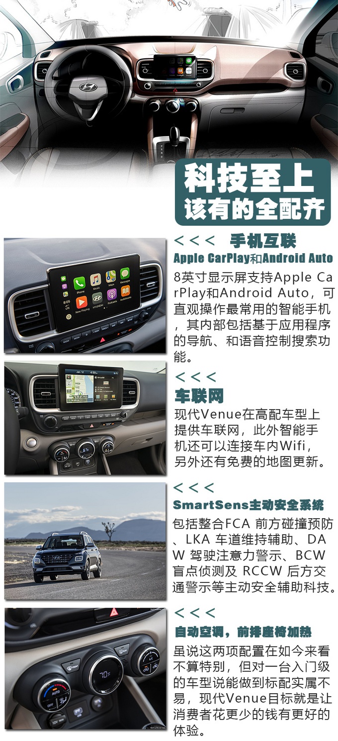 虽然定位于小型SUV,但Venue在配置方面比ix25更丰富,支持现代Blue Link手机App远程启动,SmartSense安全辅助系统全家桶也是有的,包括注意力警示、车道保持、盲点提醒等一系列的功能,自适应巡航、主动刹车等功能则会在中配以上车型的标配;高配车型上将提供手机无线充电,17英寸轮毂;顶配车型上还会增加红外线暖膝装置,这个黑科技能够保持驾驶员膝盖的温度(降低得老寒腿的概率)。