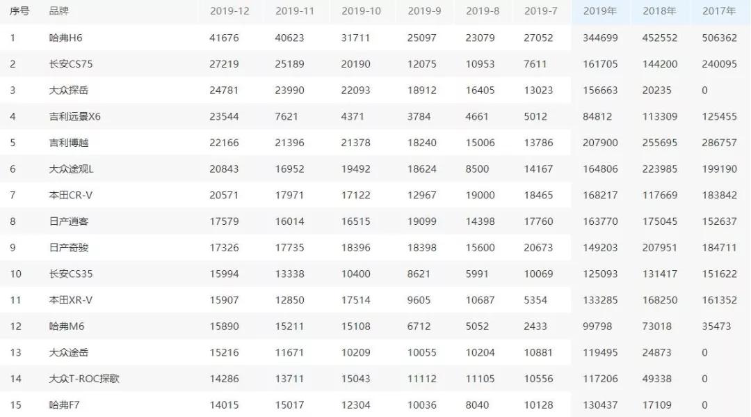 去年销量前15的SUV里,自主品牌不少,10万元档的车型更不少