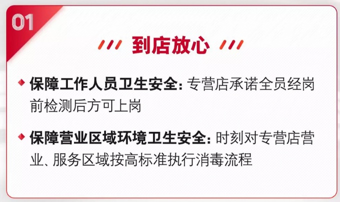 试驾安心:通过及时消毒保障试驾安全,部分城市专营店提供10公里范围内上门接送试驾服务让客户试驾安心。