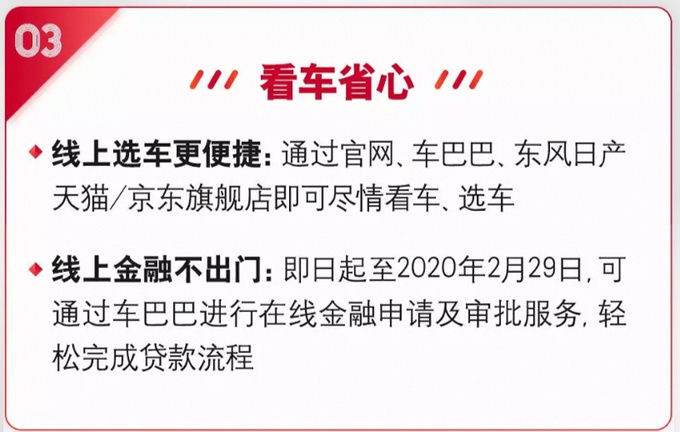 看车省心:通过官网、车巴巴、东风日产天猫、京东旗舰店等线上平台让客户选车更便捷,线上金融服务让客户看车省心;