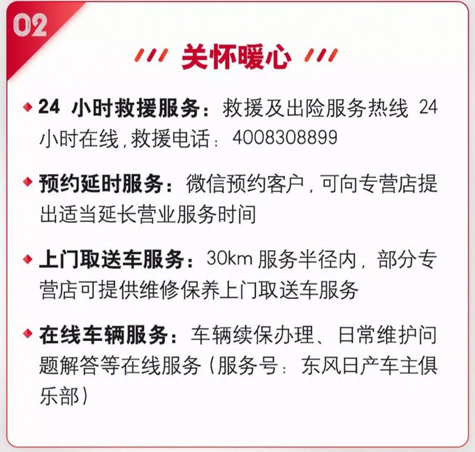 关怀暖心:通过24小时救援服务、预约延时服务、上门取送车服务和在线车辆服务给予客户暖心关怀;