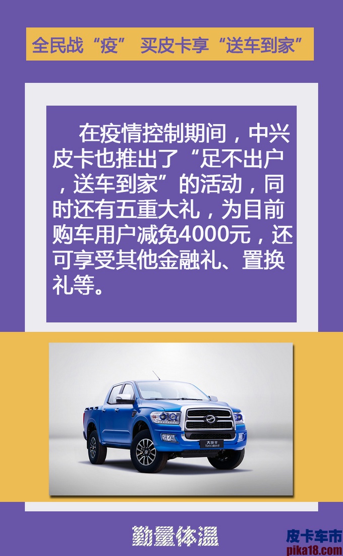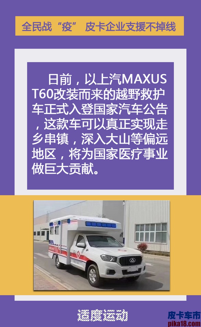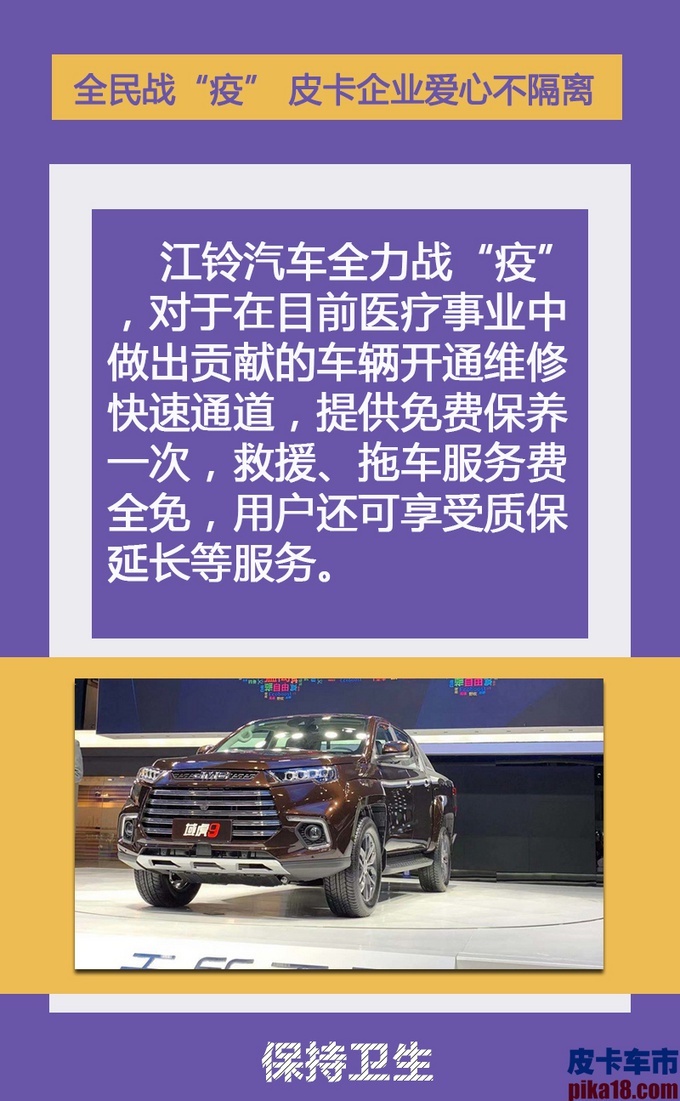 面对疫情的发生,我国车企纷纷表现出强烈的社会责任感,向重灾区捐钱捐物、面对经销商推出减压政策、给消费者制定各种补贴、为用户启动爱心通道……在疫情防控的关键时期,各大皮卡车企同样站在了阻击战“疫”的前线,捐赠皮卡、连夜赶工、制造越野救护车、联合车主共同为灾区提供服务,为打赢病毒狙击战提供了信心。