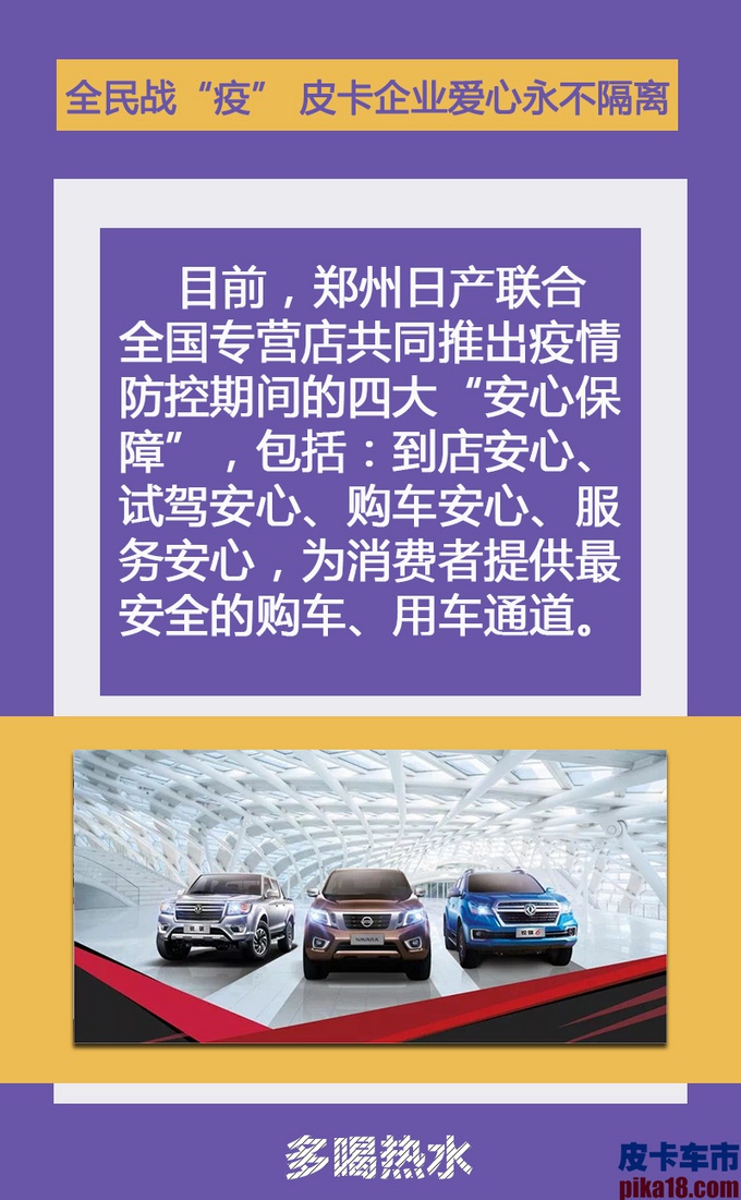 为进一步保障疫情控制期间购车消费者的安全,郑州日产联合全国专营店共同推出疫情防控期间的四大“安心保障”。一、到店安心:专营店承诺全员经过岗前健康安全监测后方可上岗,且保障全员工作期间佩戴口罩等安全防护设备,同时对专营店全区域进行高标准消毒工作。二、试驾安心:试驾车辆均进行高标准消毒,为用户准备一次性手套和洗衣液,保证试驾安心,部分专营店还开启提供十公里内的送车上门试驾服务。三、购车安心:用户可信性线上看车,且有专营店提供的50公里内的送车上门服务。四、服务安心:3月31日前,为车主提供单程50公里的免费救援服务;3月31日前达到保养里程或时间的车主延长3个月保养等。