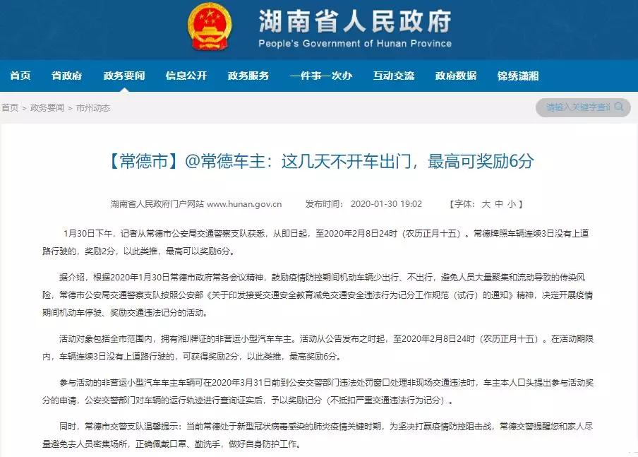 而疫情期间,常德市政府更是实行了“不开车,有奖励分”的奖励措施。奖励对象包括全常德市范围内,拥有湘J牌证的非营运小型汽车车主,从2020年1月30日起,至2020年2月8日24时(农历正月十五)内,车辆连续3日没有上道路行驶的,可获得奖励2分,以此类推,最高奖励6分。
