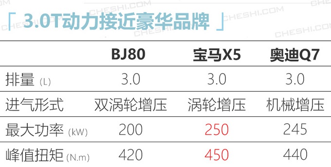 BJ80目前仅布局了2.3T动力车型,2020款车型将新增2.0T与3.0T V6动力版本可选。目前BJ80 2.0T车型动力信息已经曝光,最大功率155kW,百公里综合油耗11.2L,该版本车型上市后的主要任务是进一步降低BJ80的购车门槛儿,为喜欢硬派越野的消费者带来更多选项,预计起售价可下探至27万元左右。而3.0T V6版本的推出目的更明确,就是要解决“小马拉大车”的尴尬,对于一台整备质量超过2吨的大块头SUV来说,3.0T V6的动力储备才更符合其车型身份。