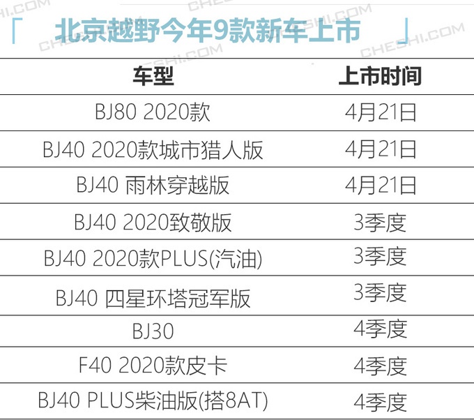 2019年是北京越野变化最快的一年,在新品牌战略的指引,及新产品持续助力下,北京越野牢牢抓住了属于自己的细分市场,强势逆袭。2020年是北京越野的产品大年,品牌将对各细分市场做出梳理与调整,补齐目前略显空白的细分领域。具体产品方面,北京越野今年将陆续推出包括BJ30、新款F40、BJ40 (配置|询价)系列以及新款BJ80 (配置|询价)在内的9款新车。其中定位入门级/年轻化SUV的BJ30由现款BJ20更名而来,依然采用承载式车身,外观造型在细节处进行了重新设计。