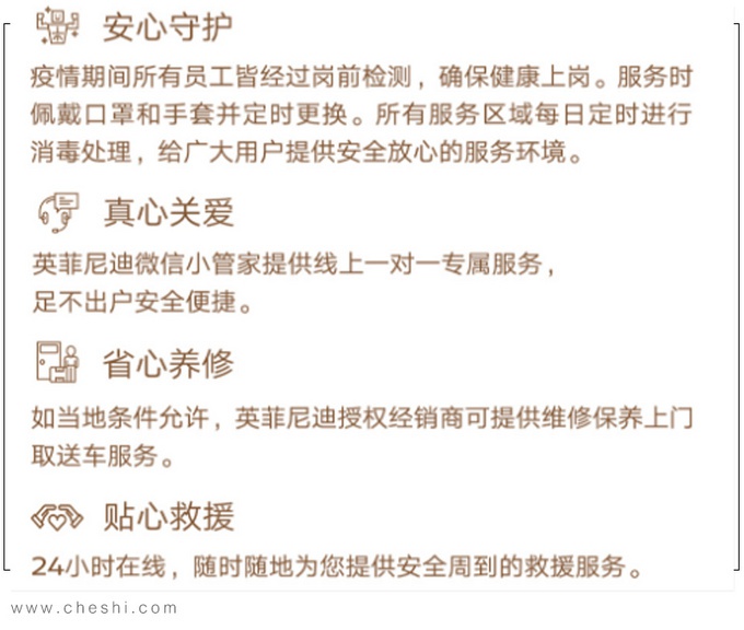 另外,英菲尼迪着力保障24小时道路救援等售后服务,及时响应每位车主的需求。在金融方面,英菲尼迪将为有还款压力的车主提供14天车贷还款延期,减轻经济之忧。为方便疫情期间购车与试驾,英菲尼迪推出了包括确保经销商店全部区域每日消毒清洁,接待人员符合健康标准且佩戴口罩等防护用具;在线销售;上门看车及试驾在内的3项举措,保障客户的健康安全。