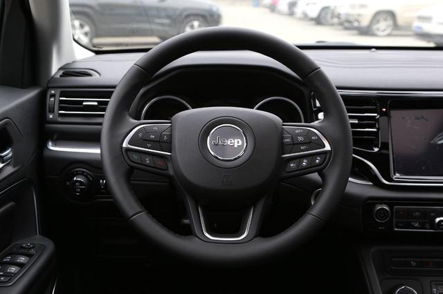 三辐式多功能方向盘采用Jepp家族设计风格,造型变化不大,握感扎实,看起来很显精致。
