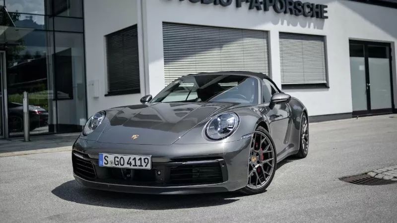 三名保安一人一台保时捷跑车,我们从左一开始说,保时捷911 Carrera,内部代号992。这代保时捷为什么被称为992,因为它来自大众集团的MMB平台,厂家希望能够延续991车系,所以起名“992”。
