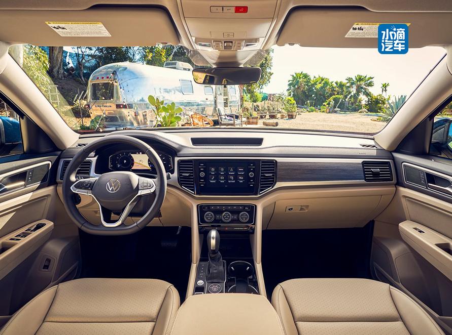 将视线转移至车内,途昂依旧保持着大众家族式设计,T字型的中控布局非常熟悉。新车通过木质饰板、镀铬材质来装点内饰,强化整体豪华感,中控屏及空调控制面板也依然是熟悉的大众风格。值得一提的是,新车采用了运动感强烈的三辐式方向盘,配合平底造型、镀铬装饰,为驾驶员提供更运动的视觉感受。