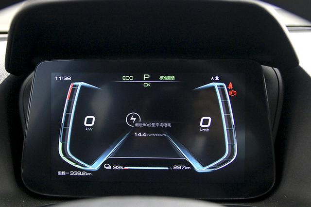 全液晶仪表在e平台车型中的使用率还是挺高,虽然尺寸不大但现实效果还是很清晰,功能也相比e1车型要更丰富。例如可通过方向盘按钮配合屏幕菜单调节空调温度等。