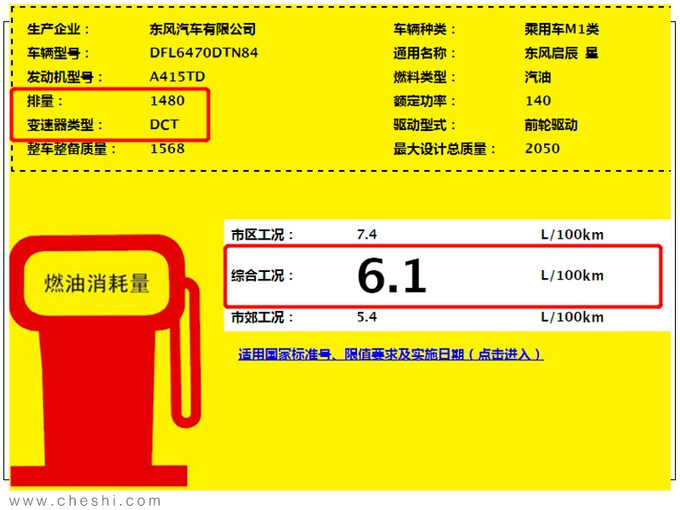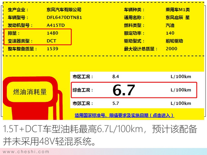 在换装全新1.5T+DCT的动力组合后,启辰星也将成为启辰动力最强的SUV,其加速性能将比匹配2.0L+CVT的T70和T90更强。油耗方面,启辰星手动挡车型每百公里综合油耗为6.8L,而自动挡车型更低,在6.1L-6.7L/100km之间。由于自动挡车型整备质量相近,但油耗相差较大,预计1.5T车型会推出不带有48V轻混的版本。