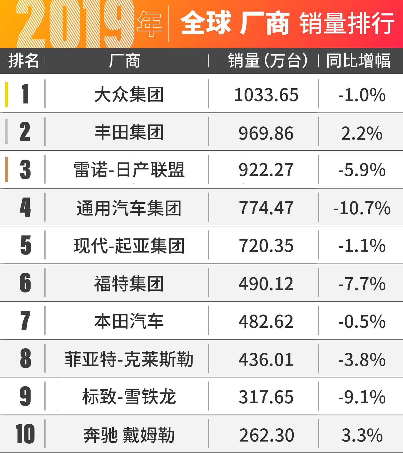 丰田紧随其后,在大环境不好的情况下,还实现了同比2.2%的增幅,将近970万台的成绩,也算是比较出色。接下来的3-5名分别是雷诺日产联盟、通用汽车和现代集团。排在第六名的是在国内“半死不活”的福特集团,紧随其后的是482万台的本田。前十名的后三位则由FCA、PSA以及奔驰拿走。