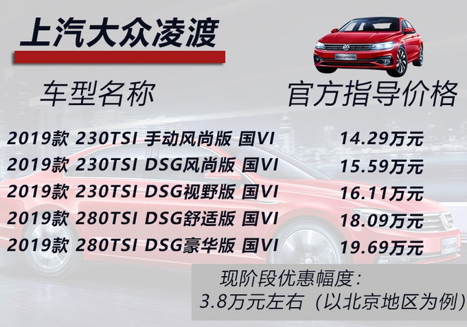 以目前北京地区为例,上汽大众凌渡存在有3.8万元左右的优惠幅度,那么在结合完优惠幅度进行计算后,其终端售价区间为10.49-15.89万元左右。