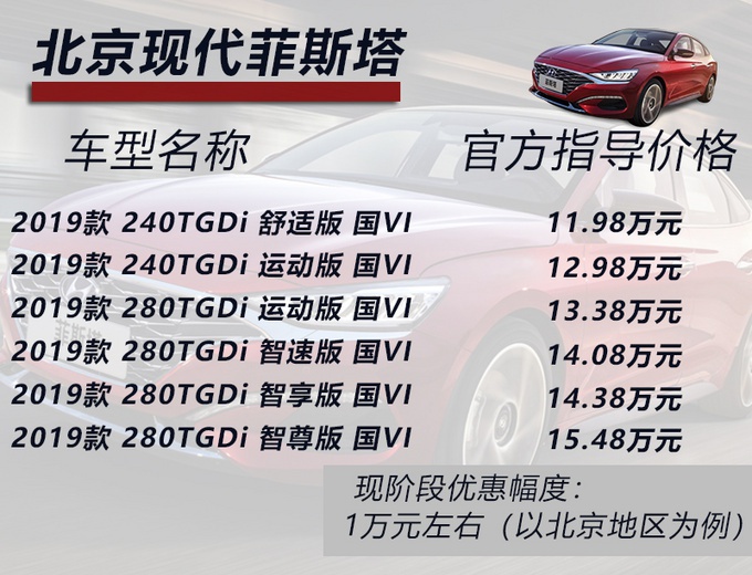北京现代菲斯塔全系共推出6款国VI版本车型,官方售价区间为11.98-15.48万元。