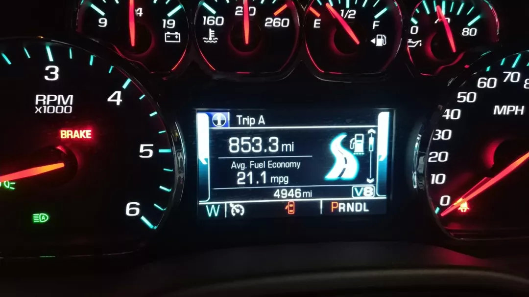 社长开了一段时间的高速,油耗是21.1mpg,换算过来,油耗是11.15L/100km。城市工况会差一些,达到了15.1L/100km。但考虑到这么大的自重和V8发动机,Tahoe的油耗依然比C63AMG要小。另外在美国的低油价下,加满将近100L的油箱,当时也就是花费400元人民币左右。所以美国确实是个适合大排量发动机的国家。