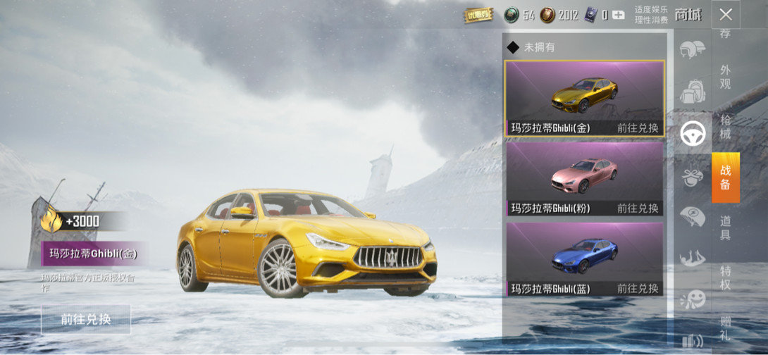 游戏中一共有三种颜色可选,分别是蓝色、粉色和金色。要想获得车辆需要通过五耀赐福活动进行概率抽取,核心思想就是充钱了,大家都懂得。根据我的了解最低198元,最高近万元才抽到兑换币。平均下来要2000-3000软妹币才能在游戏里获得这款玛莎拉蒂吉博力的皮肤。这个价格在游戏里算得上是很高了,所以很多小姐姐对这款新载具皮肤非常感兴趣。由于游戏的受众面很广,所以玛莎拉蒂吉博力豪车的名号在玩家中迅速传开,一举打破了女生只认识宝马和大G (配置|询价)的豪车认知垄断局面。游戏里口口相传的宣传手段真是高明,省预算又能获得最大的宣传广度。