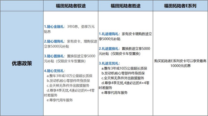 福田拓陆者针对最新推出的拓陆者驭途皮卡、拓陆者胜途皮卡,以及现有的拓陆者E系列产品都推出了专属的购车优惠政策。(安惠多重礼可以和安享购车礼、安购电商礼叠加使用)